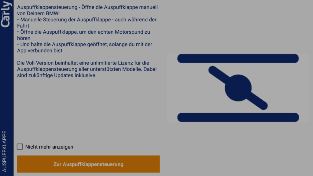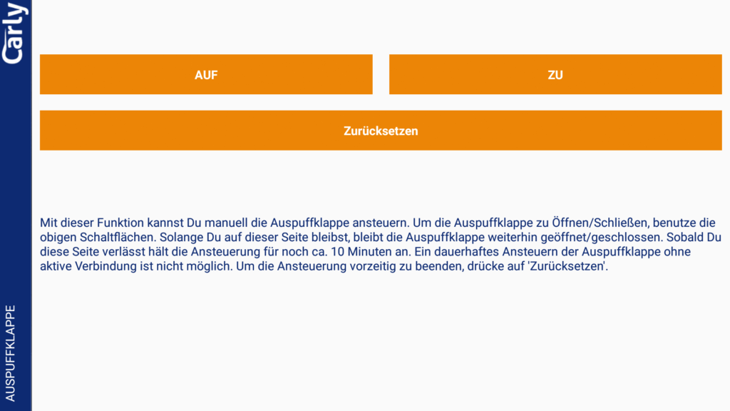 Diese Funktion wird nicht StVo konform sein. Sie sollte lediglich auf Privatgelände zum Testen der Klappensteuerung genutzt werden.