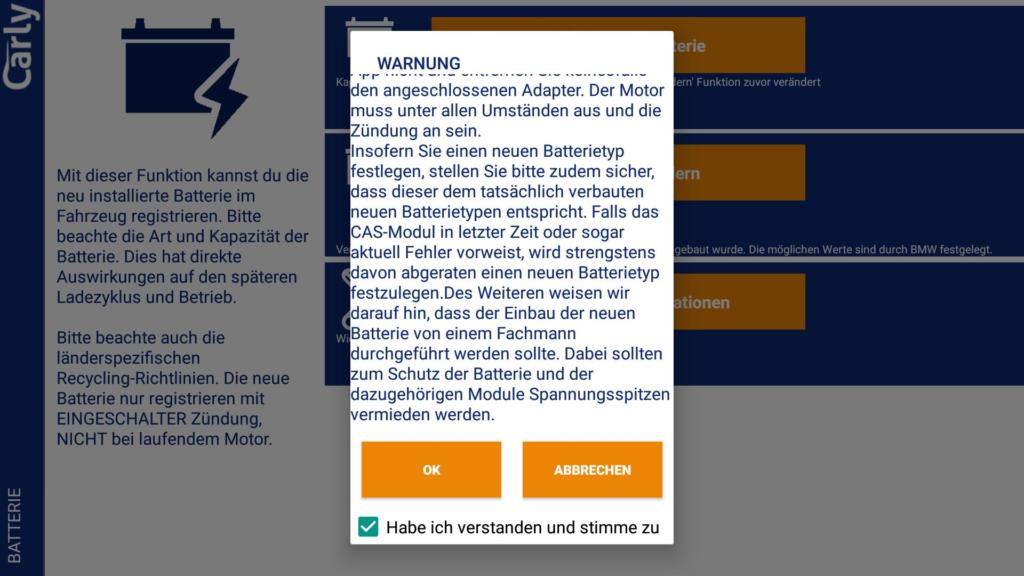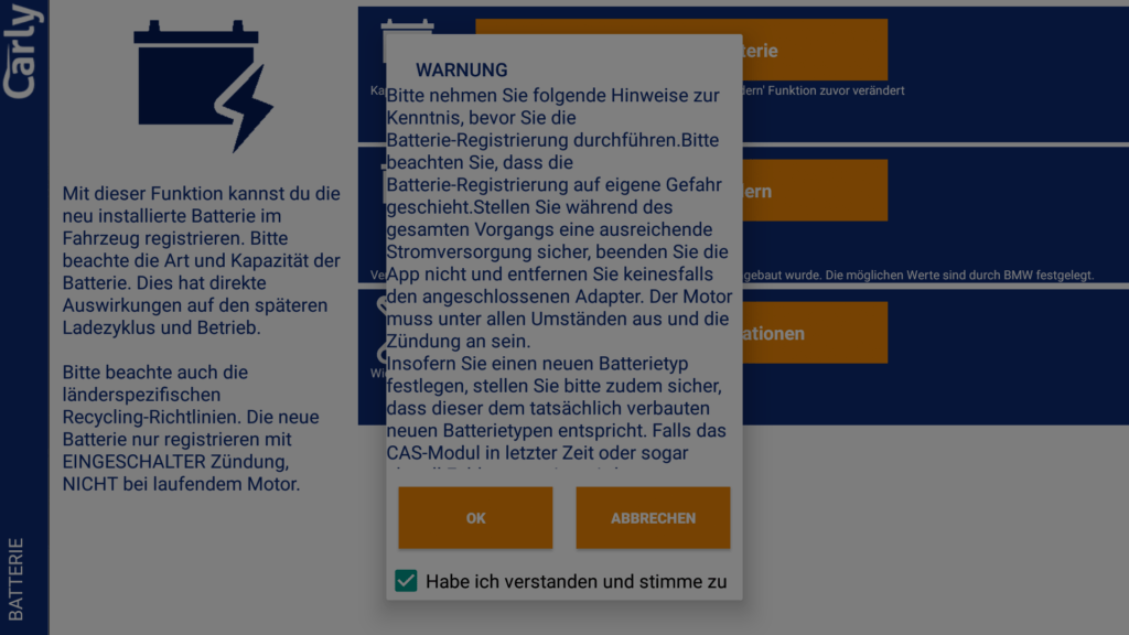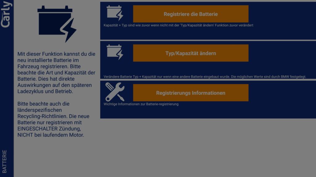 Die App bietet auch die Möglichkeit eine neue Batterie ans Fahrzeug anzulernen. Dies ist bei BMW notwendig, da dort eine intelligente Ladeelektronik verbaut ist, die das Ladeverhalten an die verbaute Batterie anpasst.