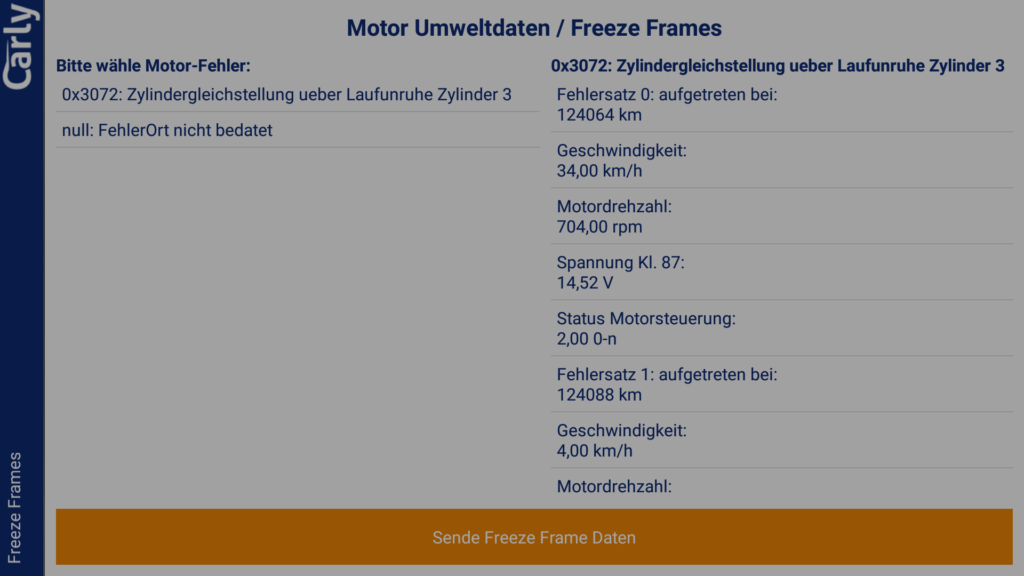 An unserem Testfahrzeug BMW E92 330i haben wir eine vollständige Diagnose vorgenommen, weil er sich kürzlich kurz nach dem Motorstart verschluckt hatte und in den Motornotlauf gegangen ist. Nach einem Neustart des Motors war der Spuk vorbei. Die App hatte dazu im Fehlerspeicher einen Fehler gefunden mit dem Hinweis „Einlass-VANOSS“. Der Fehler ist danach (zum Glück) nicht mehr aufgetreten und konnte mit der Carly für BMW App gelöscht werden. Ab und an wird beim Warmstart ein Fehler mit der „Zylindergleichstellung“ angelegt. In den angehangenen Bildern kann man schön das Feature der „Freeze-Frames“ sehen, welches Detaildaten zum Fehlerzeitpunkt enthält. Dies ist ein tolles Feature um den genauen Fehlerzeitpunkt und die Ursache identifizieren zu können. Leider war hier im Beispiel nur ein Freeze-Frame aussagekräftig. Ob dies an der App oder an den Diagnosedaten selbst liegt ist uns unbekannt.