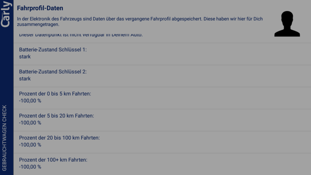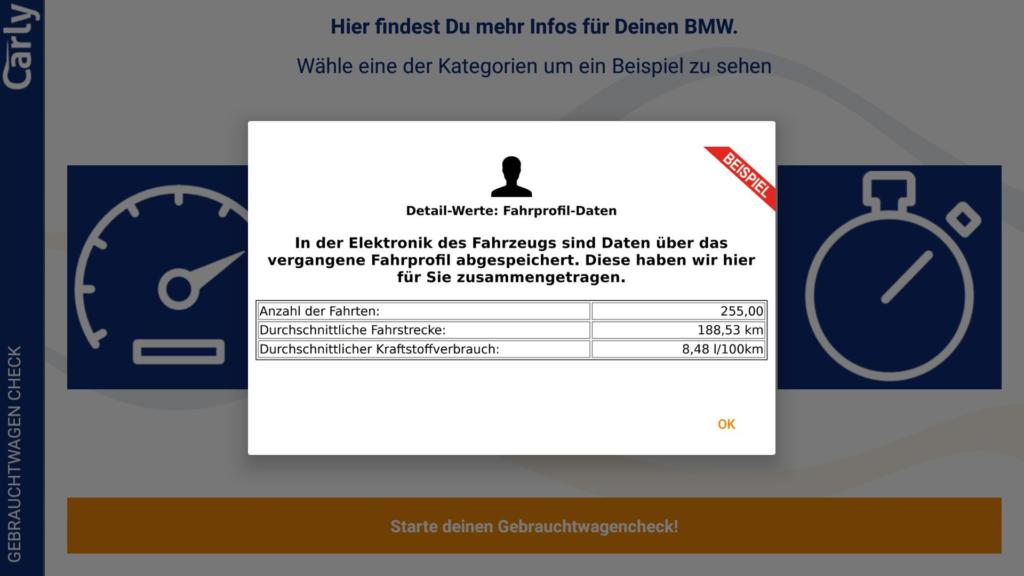 Der Gebrauchtwagencheck soll laut Hersteller Tachobetrug aufdecken. Dazu werden die Kilometerstände, die Fahrgestellnummer, die Betriebsstunden des Motors, das Fahrprofil, die Durchschnittsgeschwindigkeit und mehr ausgelesen. Leider wurden bei unserem BMW F30 335i die Fahrprofildaten nicht richtig ausgelesen oder angezeigt. Dies wäre bei einem Gebrauchtwagenkauf sicher sehr interessant gewesen, da man daran sehr gut ermitteln könnte, ob das Fahrzeug eher ein Lang- oder Kurzstreckenfahrzeug war.