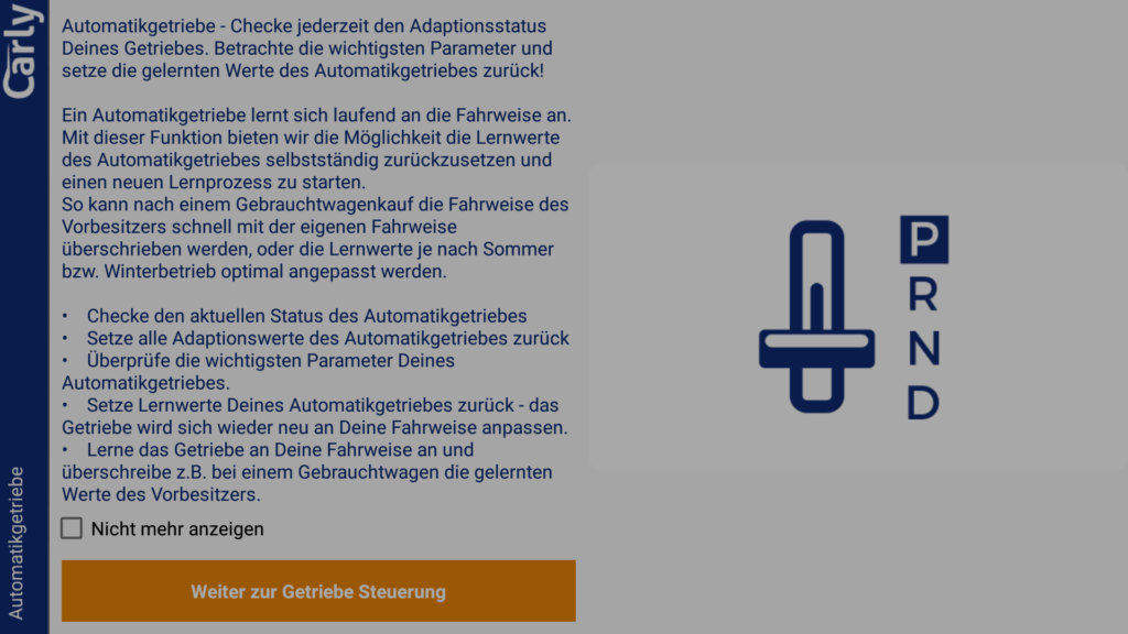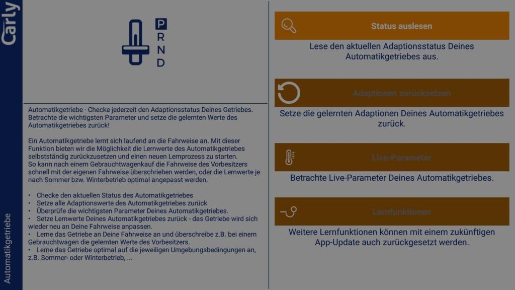 Die genannte Funktion ermöglicht es das Getriebe neu an die Umgebung und den Fahrstil des Fahrers anzulernen. Dazu kann mit der App die Getriebeadaption zurückgesetzt werden. Der Hersteller plant dazu noch weitere Funktionen (siehe letzter Punkt im Menü).