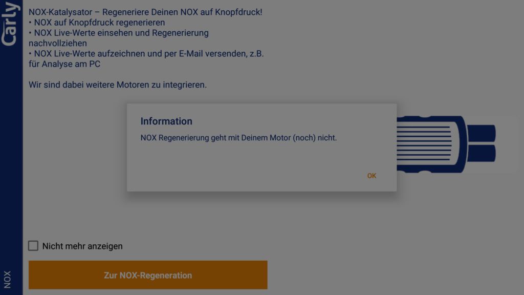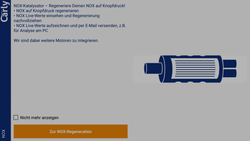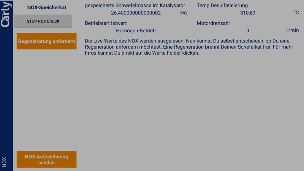 Bei unserem BMW E92 330i mit Direkteinspritzung ist ein NOx-Katalysator verbaut. Die App bietet eine Funktion um den NOx-Kat auf Wunsch freizubrennen. Wir haben uns nur die hinterlegten Werte angesehen. Durchgeführt haben wir das bei unserem Fahrzeug nicht. Eine ähnliche Funktion existiert auch für Dieselfahrzeuge mit Dieselpartikerfilter. Auch dort waren plausible Werte zu sehen.