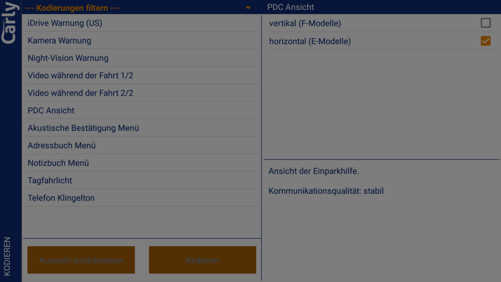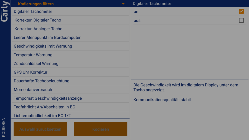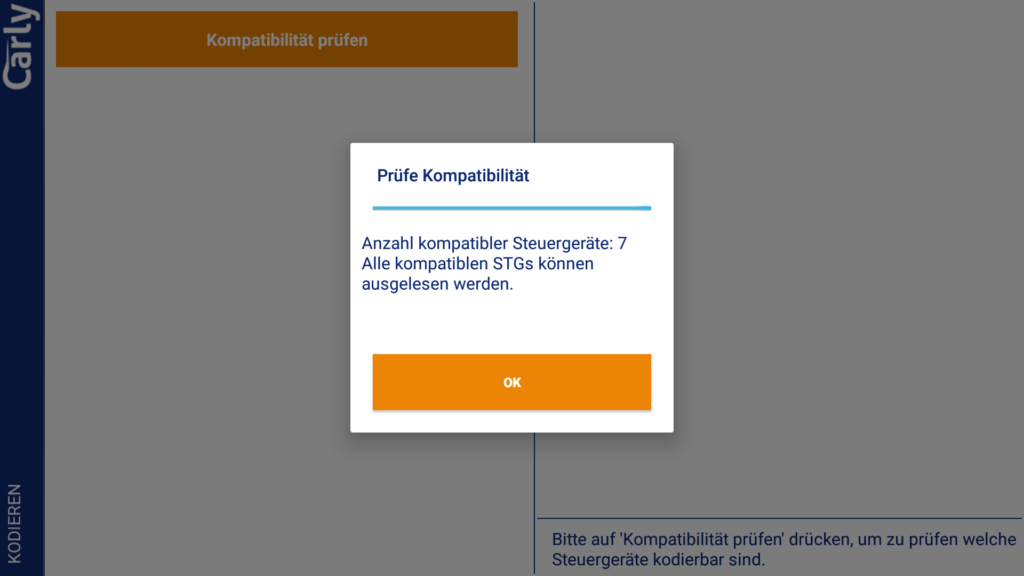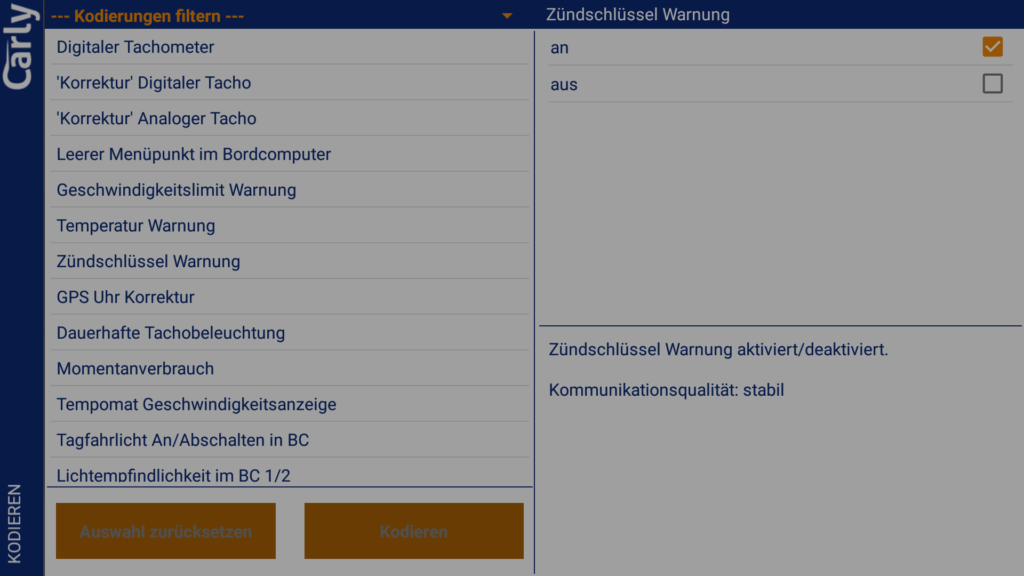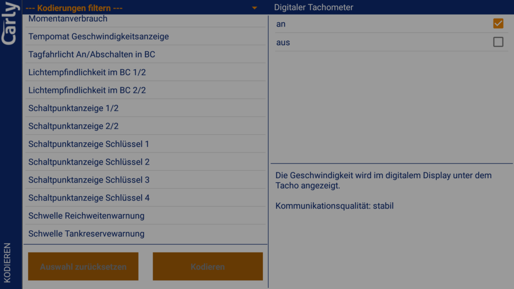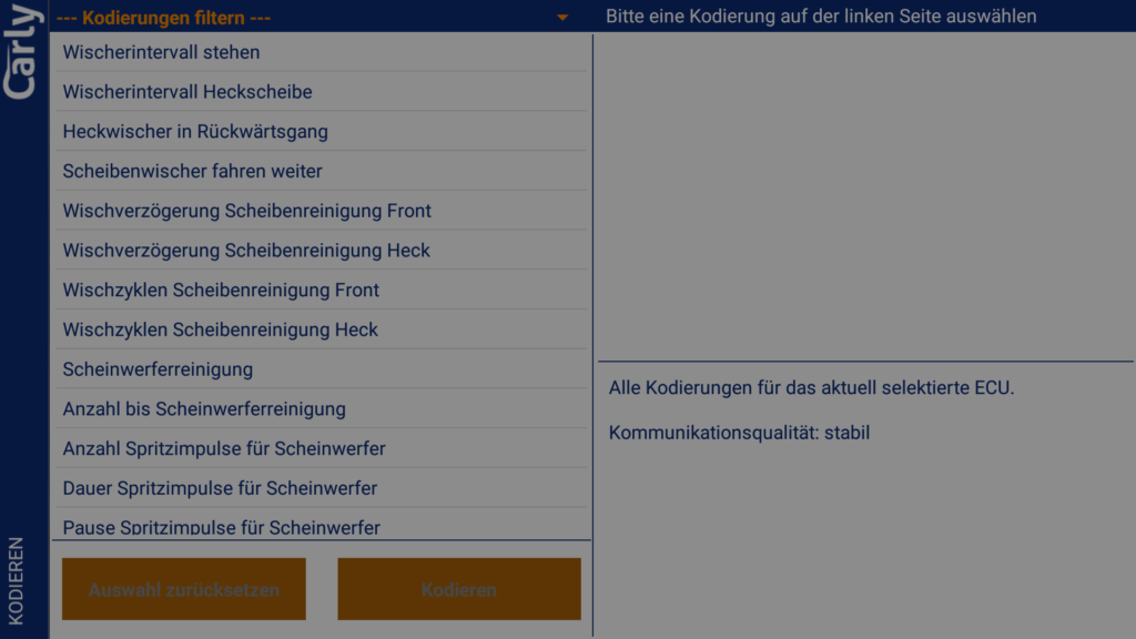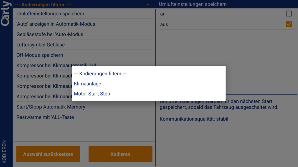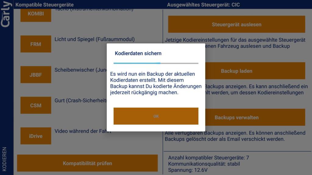 Zunächst einmal müssen wir den Punkt Kodieren in der Übersicht der App auswählen. Nach der Kompatibilitätsprüfung kann das jeweilige Steuergerät ausgewählt und es muss manuell von den Kodierdaten ein Backup angelegt werden. Dies hätte unserer Meinung nach gerne im Hintergrund geschehen können, da dies die Nutzung unnötig verkompliziert. Danach können auf diesem Steuergerät Codierungen vorgenommen werden. Der Endanwender interessiert sich aber weniger für die Namen der Steuergeräte und muss daher zunächst alle Steuergeräte durchgehen, um die gewünschten Codierungen finden zu können. Dies hätte besser auf einer Maske mit Suchfunktion untergebracht werden sollen. Die Filterfunktion innerhalb der einzelnen Steuergeräte wäre schon auf der Übersichtseite der Steuergeräte hilfreich gewesen.