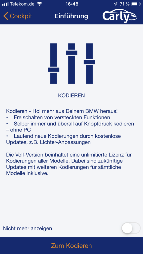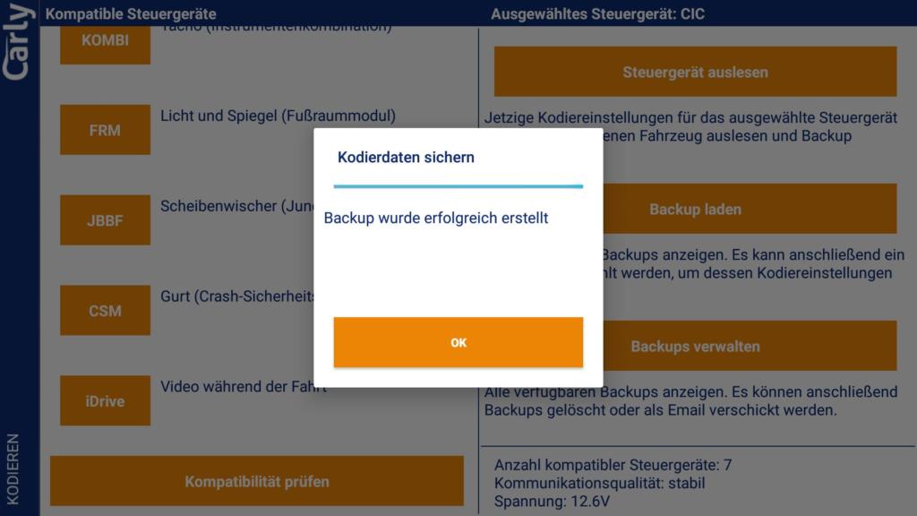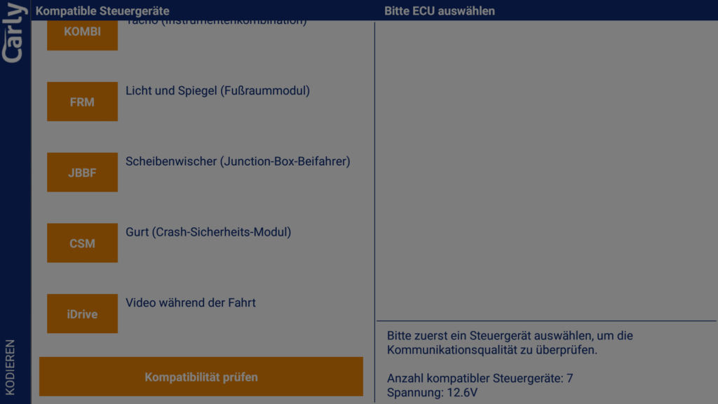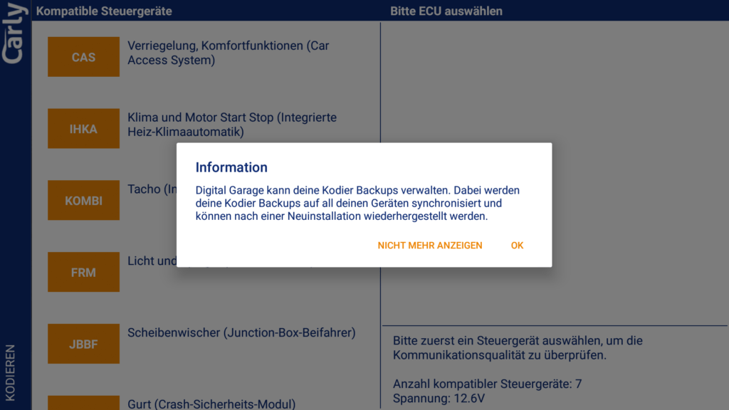 Sehr positiv aufgefallen ist uns ein Punkt. Bei einem unserer Testfahrzeuge (E92) hat die App die Codierung des FRM-Moduls verweigert. Dies erfolgte mit einer Warnung inklusive Verweis auf der Hilfeseite von Carly, in dem die Ursache genau erklärt wird.