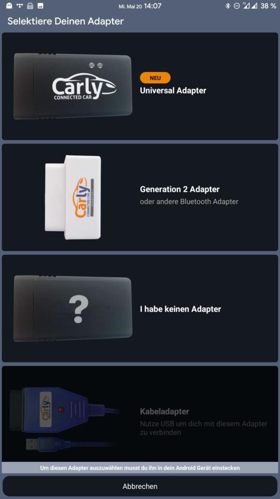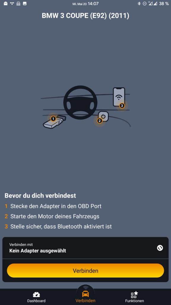 Im ersten Schritt habe ich das zu untersuchende Fahrzeug (BMW E92 Coupé) ausgewählt. Carly bereitet daraufhin zunächst softwareseitig alles für dieses Fahrzeug vor. Anschließend muss der OBD-Adapter in die OBD-Schnittstelle des Fahrzeugs eingesteckt und die Verbindung mit Carly aufgebaut werden.