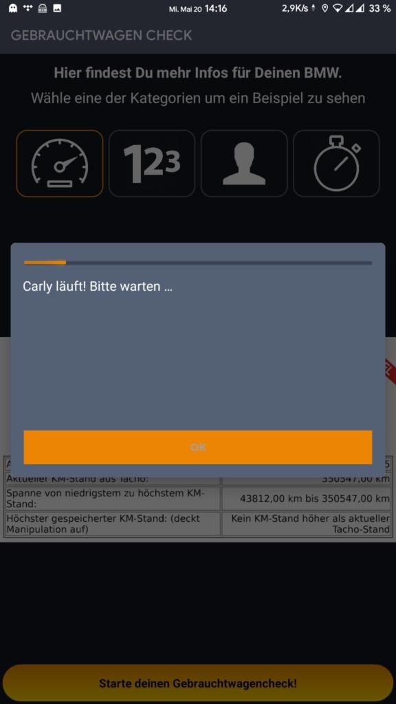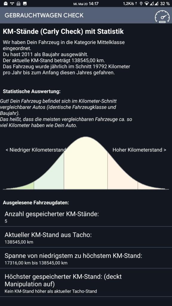 Als nächstes probieren wir den Gebrauchtwagen Check der App aus. Dort liegt die Durchschnittsgeschwindigkeit im Mittel der Fahrzeuge, die bei Carly bekannt sind. Schöne Funktion, die beim Gebrauchtwagenkauf neben den sonstiges Funktionen der App vor dem ein oder anderen Fehlkauf schützen kann.